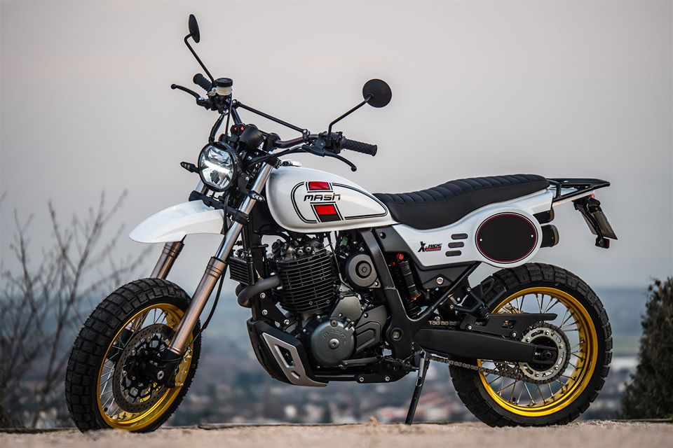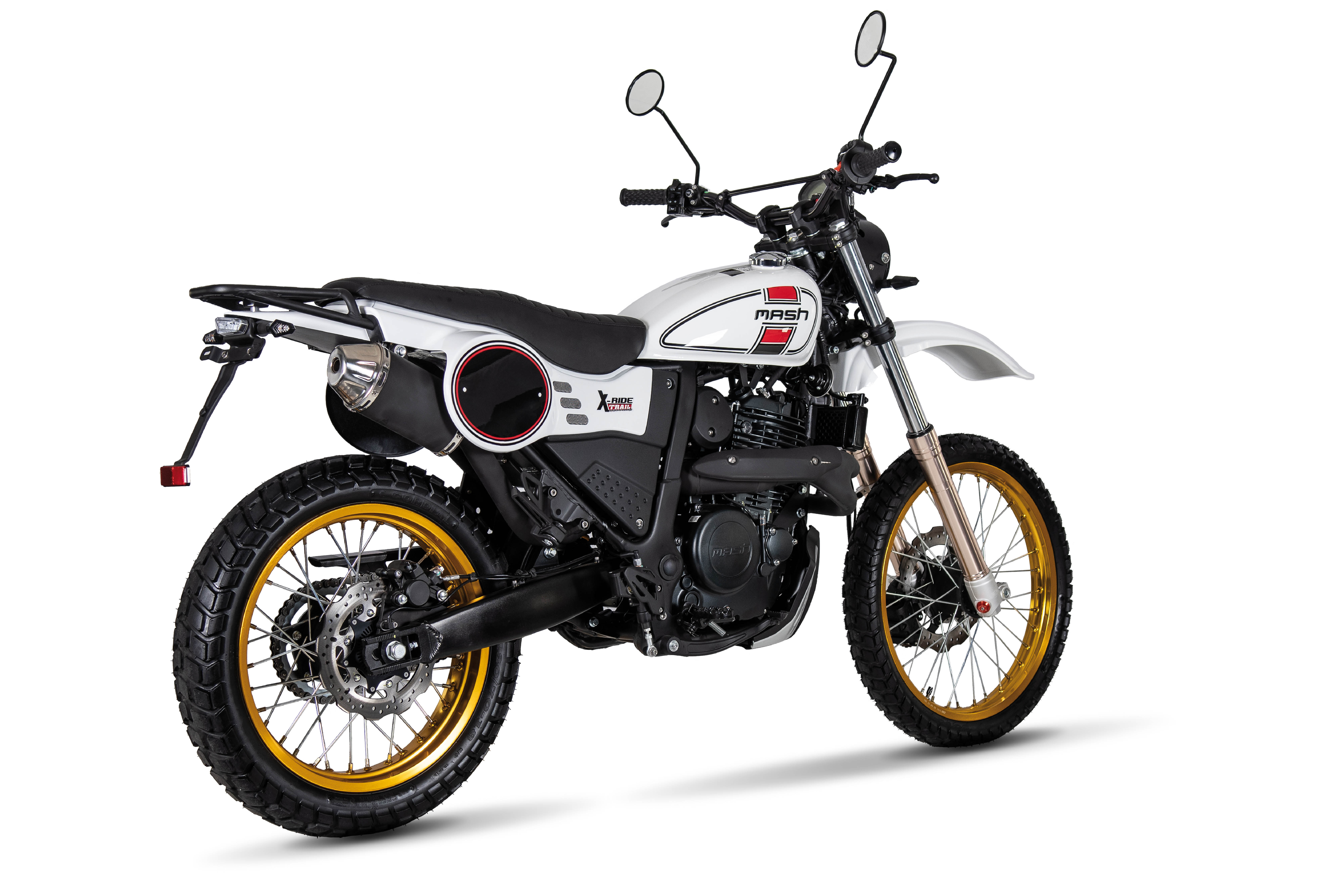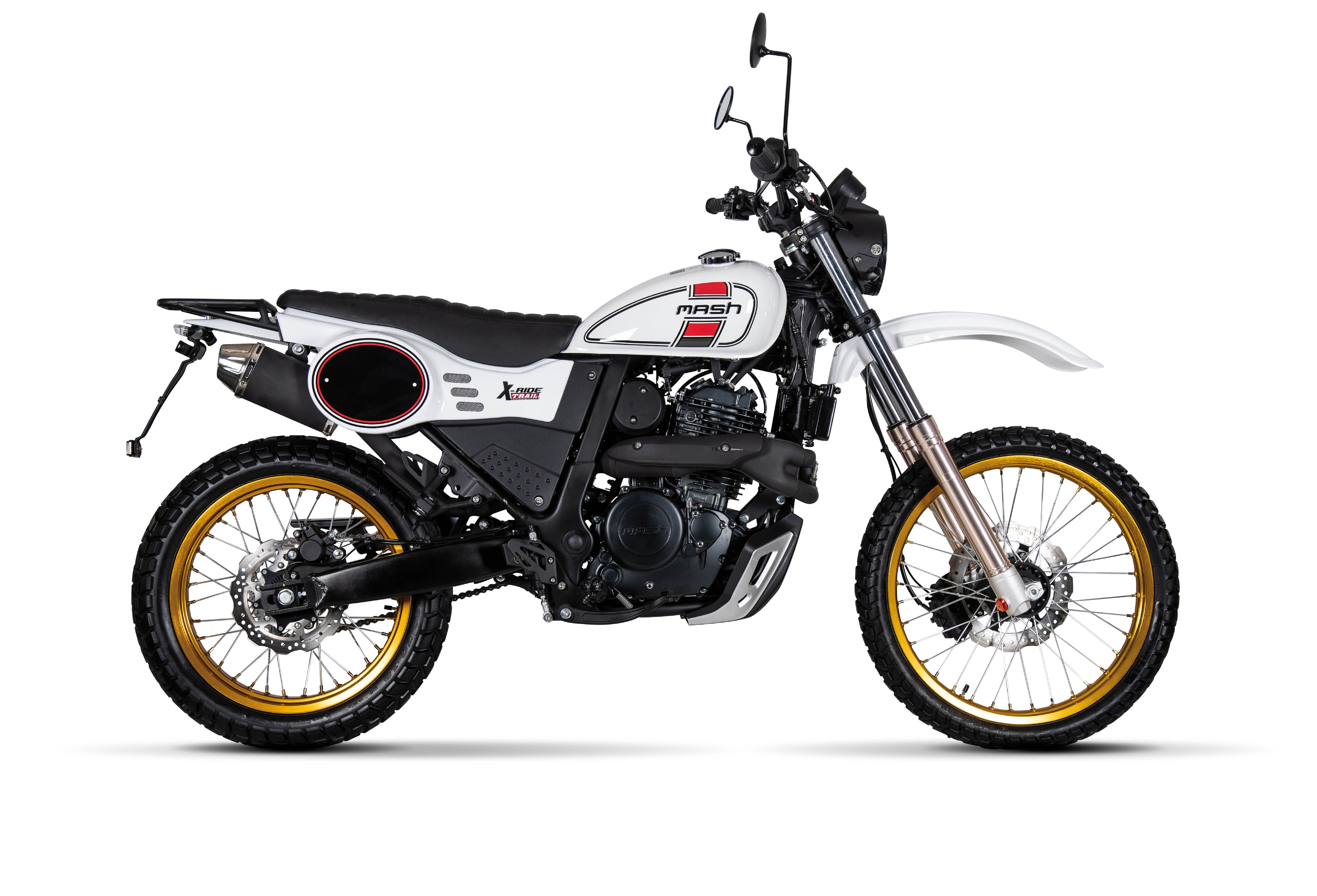 Im Mash-Angebot gibt es die X-Ride 650 Trail in der wunderschönen Variante mit 21"/18" Rädern, goldeloxierten Felgenringen und der klassischen weißen Farbgebung mit roten und schwarzen Akzenten. Hier wird einem nur allzubekannten japanischem Klassiker vergangener Endurodekaden gehuldigt, da muss man nichts weiter sagen.